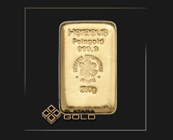 U ponudi imamo zlatne poluge od 250 g ugledne nemacke kompanije Heraeus. Heraeus je jedna od vodecih Evropskih kompanija za proizvodnju proizvoda od investicionog zlata. Pod brendom Heraeus, posluju svajcarska robna marka Argor Heraeus, austrijska kovnica Munze Osterich i nemacka robna marka Heraeus. Sve kovnice koje posluju pod ovim brendom, poseduju ” GOOD DELIVERY ” sertifikat. Isti, garantuje besprekoran kvalitet ( cistocu i tezinu ) investicionih proizvoda. Isti, izdaje udruzenje ucesnika Londonskog trzista plemenitih metala (London Bullion Market Assocoation, LBMA).